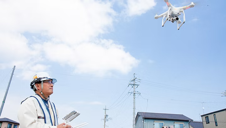 工事には最新技術を取り入れています。ドローンを使用して、工事写真を撮影、測量を行います。